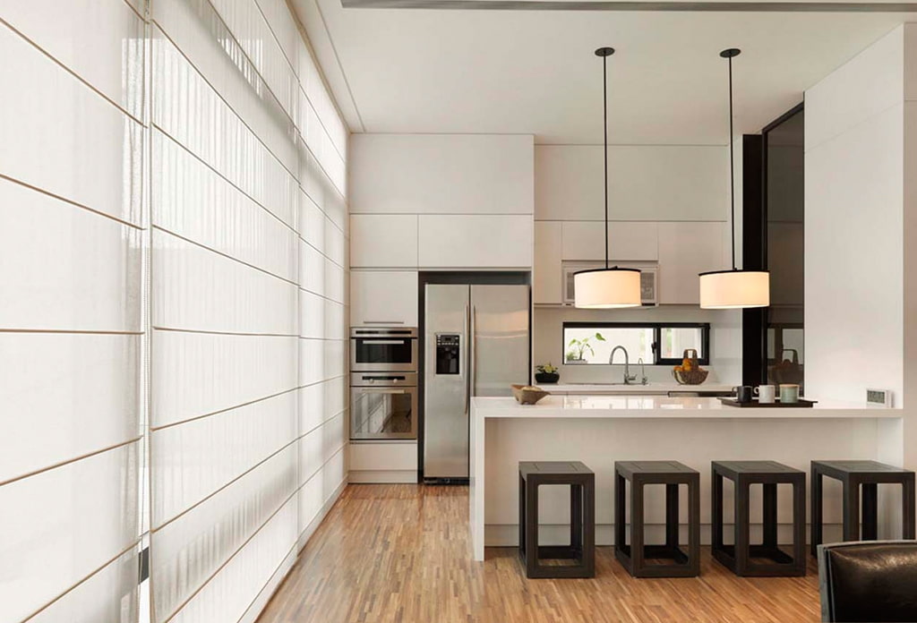 In the photo, long light-colored Roman curtains in a high-tech kitchen.
