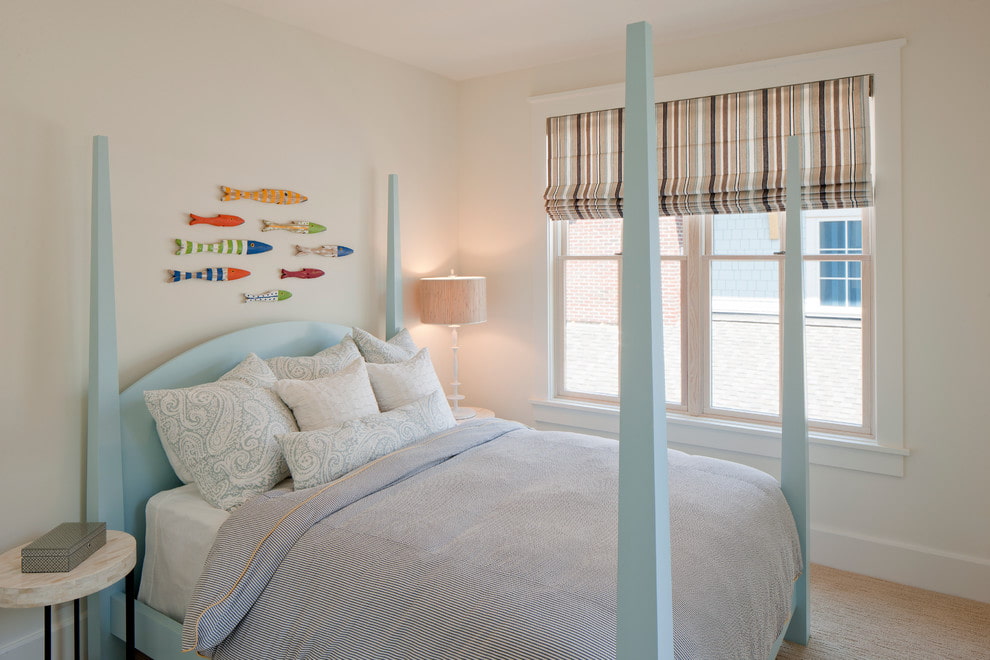 In the photo there are dark blue Roman curtains with a white pattern in the nursery in a nautical style.