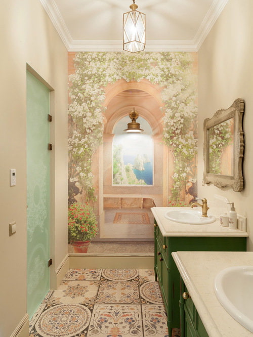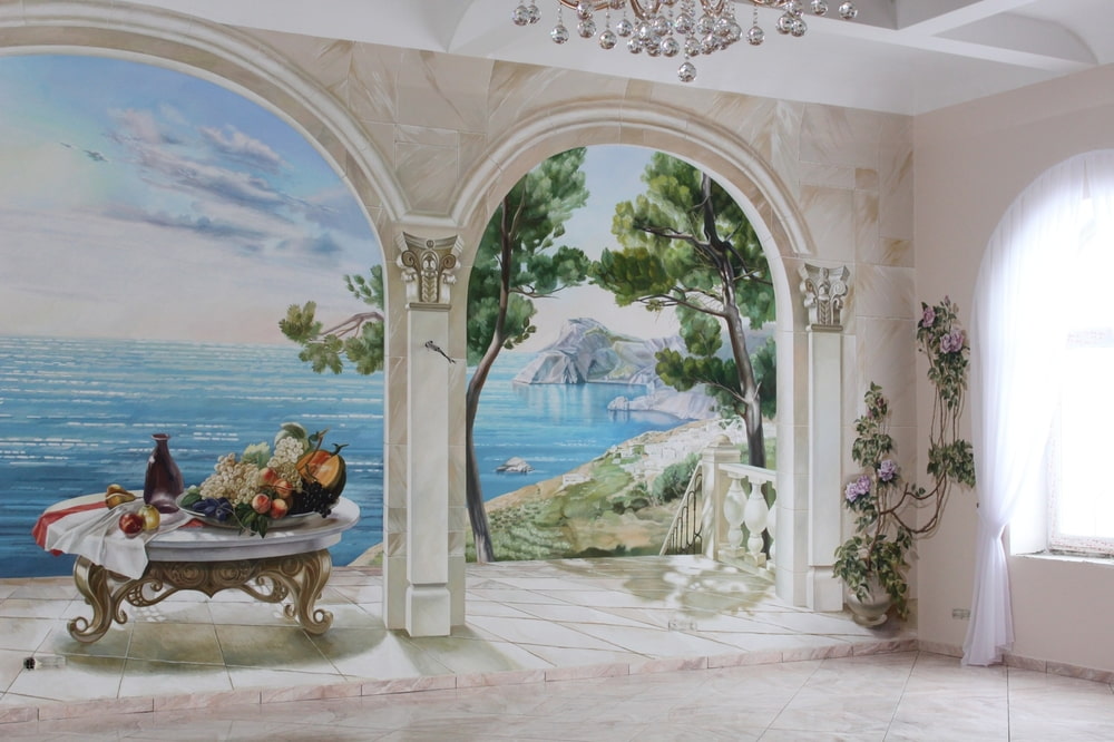 - 3D drawing... A kind of illusion of the continuation of the room. For these purposes, they often depict a landscape, a window with a beautiful view, a terrace, a bridge across the river - see the photo below for an original example.