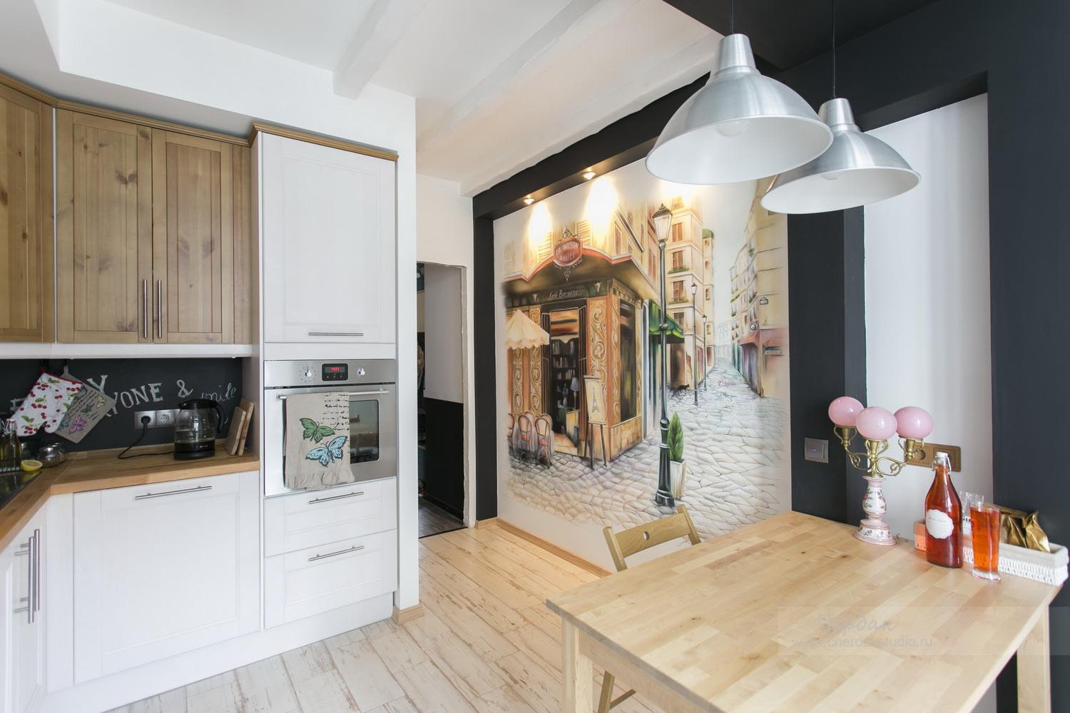 However persistent the paints are, surfaces near the sink or stove should be avoided. Drops of water and fat, as well as temperature extremes will significantly shorten the life of the finished masterpiece. Most often, in the kitchen, they choose an area near the dining table or an apron outside the wet area.