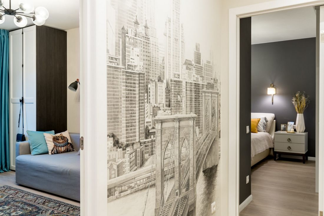 The use of wall painting in the interior of the hallway will make this boring space much more interesting. Choose only one of the most visible sides and place on it an abstract canvas or a view of a city with streets.