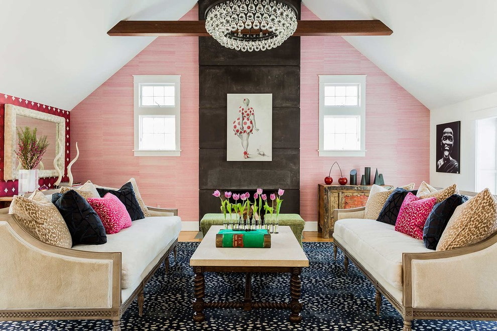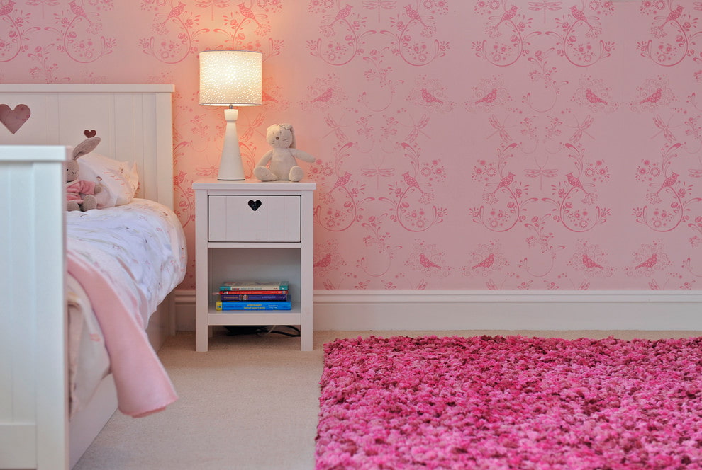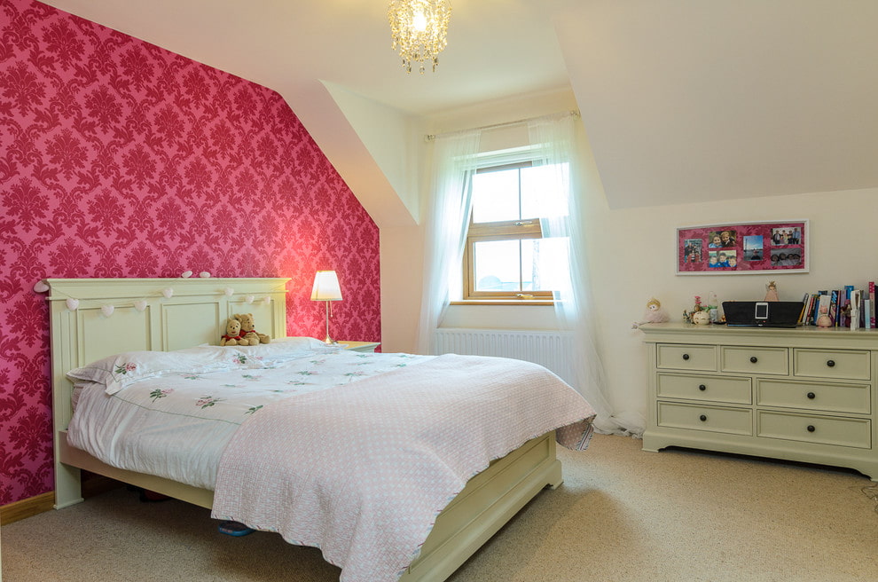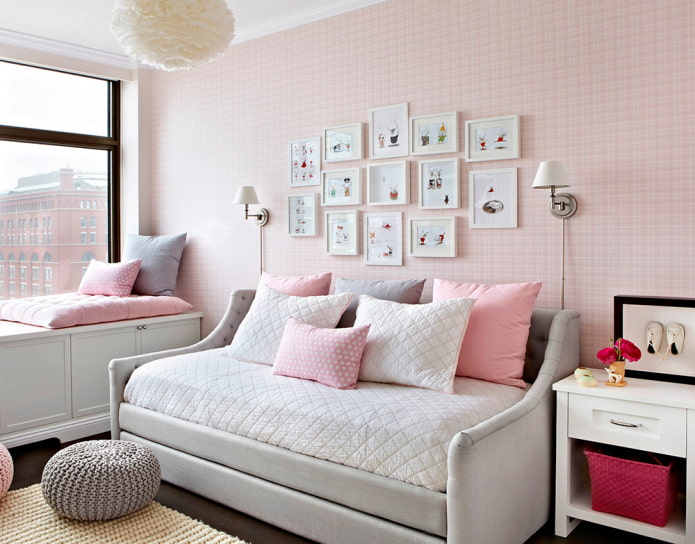 - if the room has low ceilings, zoning with companion wallpaper will add height to the space, and one main wall, decorated with pink wallpaper, will give the room light and grace.