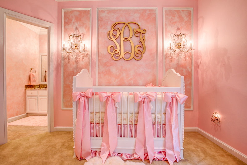 The classic design of the nursery is soft pink tones.