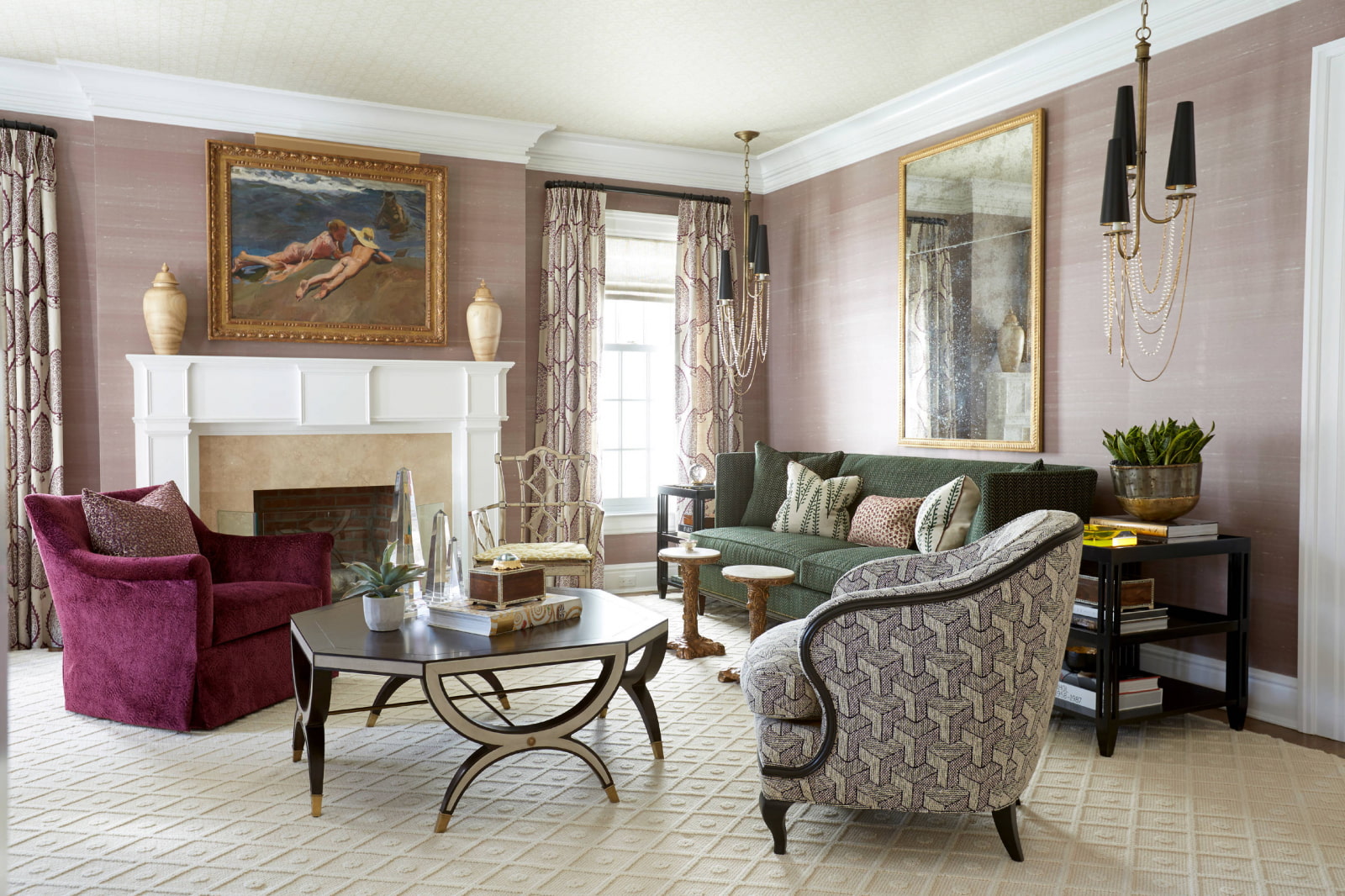 - furniture of an array of dark tones looks favorably against a background of pink wallpaper;