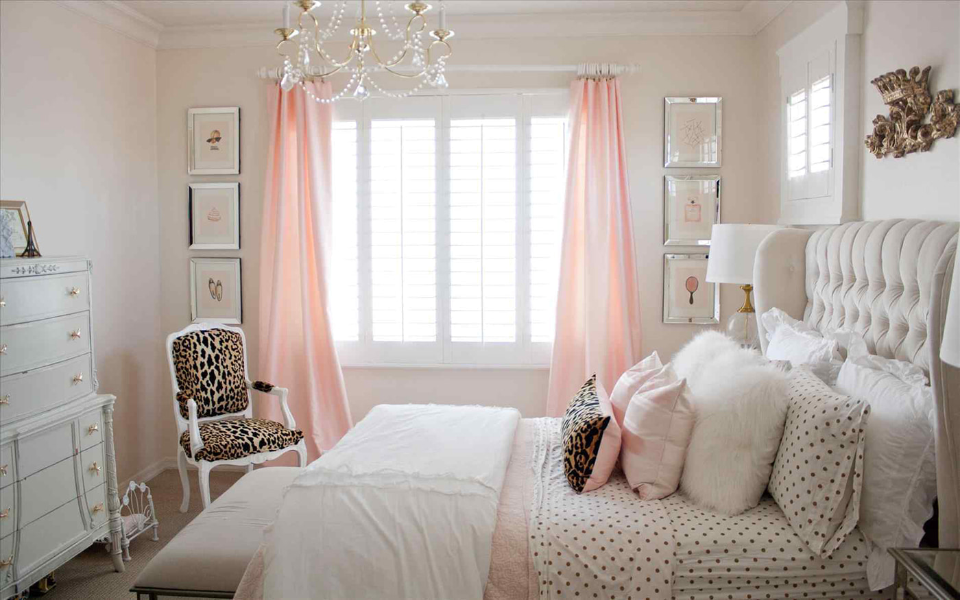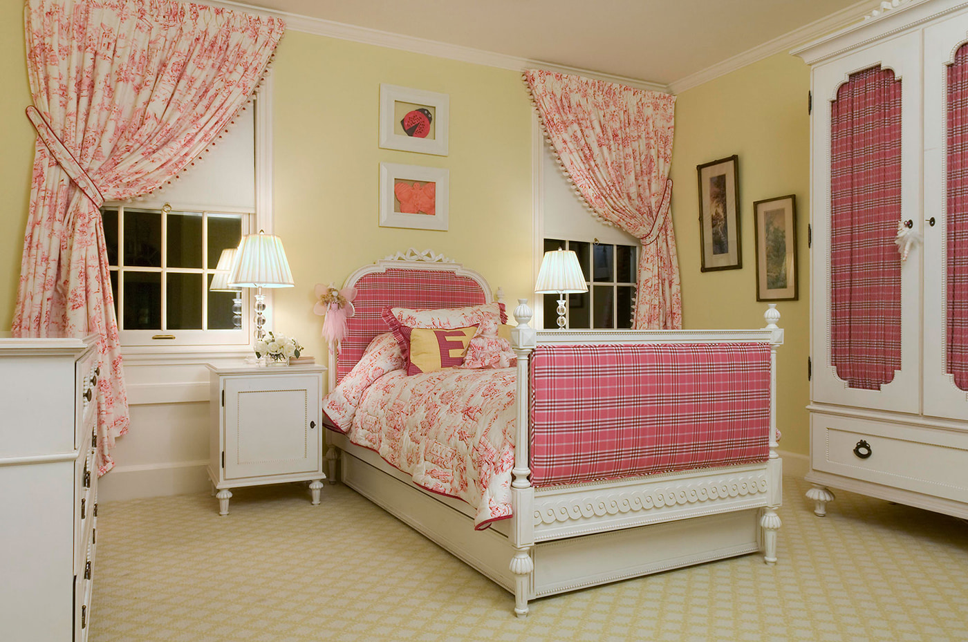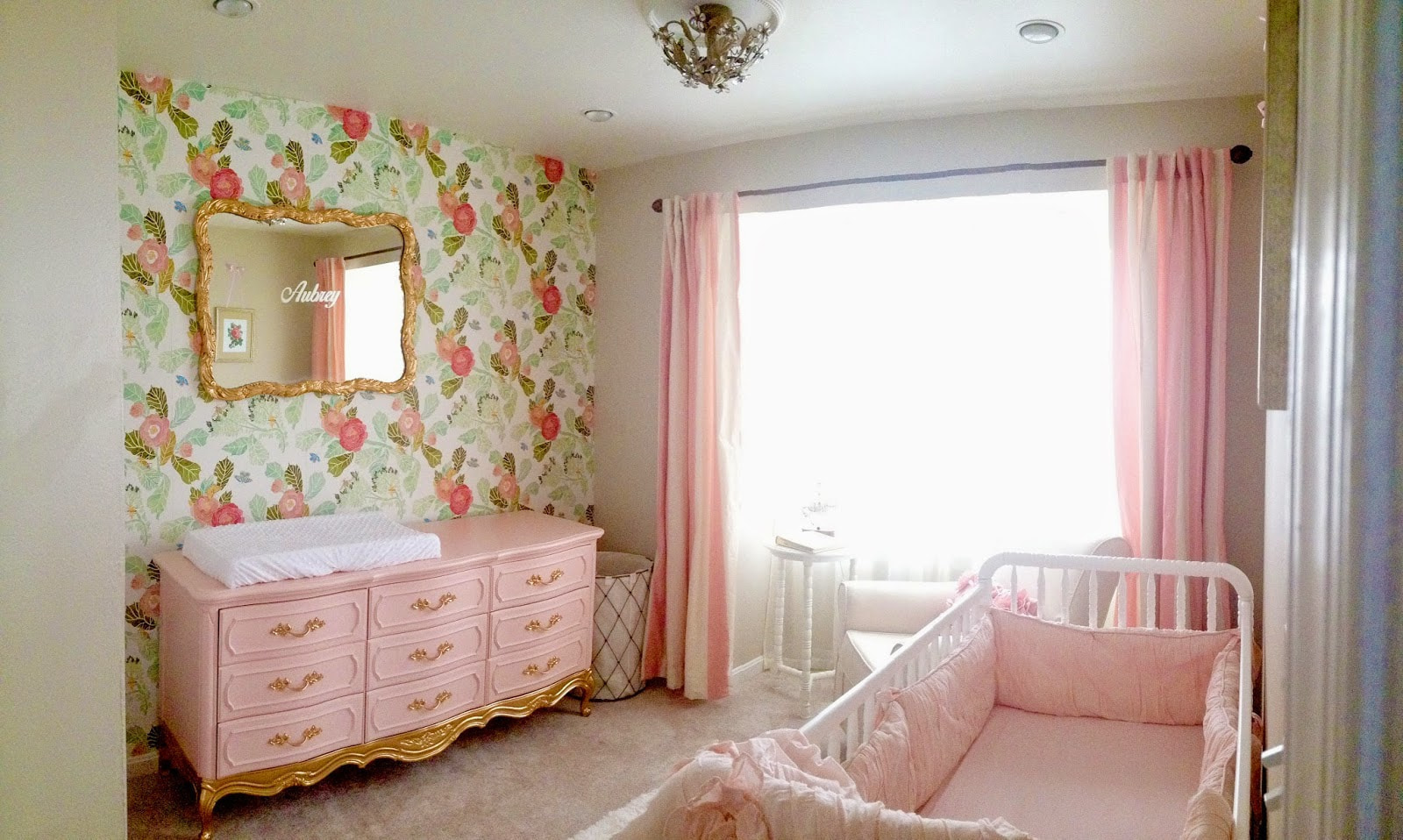 Pictured is a bedroom with pink wallpaper and curtains, complemented by a floral pattern.