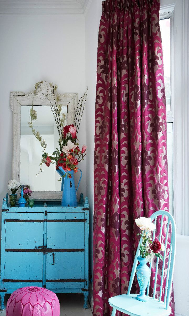 This shade attracts attention. Fuchsia curtains are appropriate for spacious rooms.