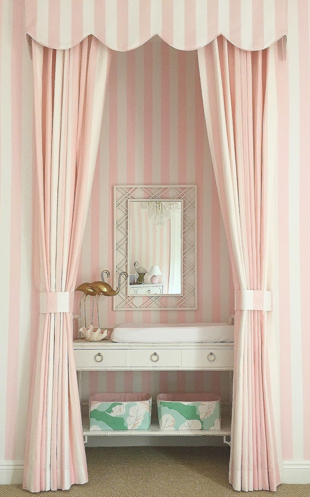 In the photo there is a nursery with a bright accent on the wall and pink striped curtains.