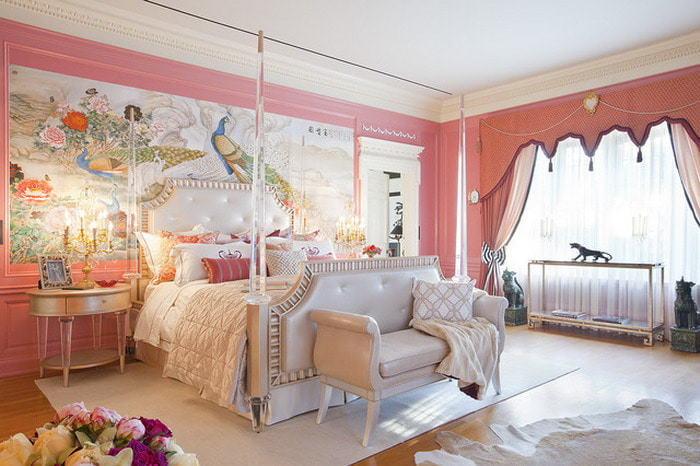 In the photo, the bedroom is fully designed in coral color.
