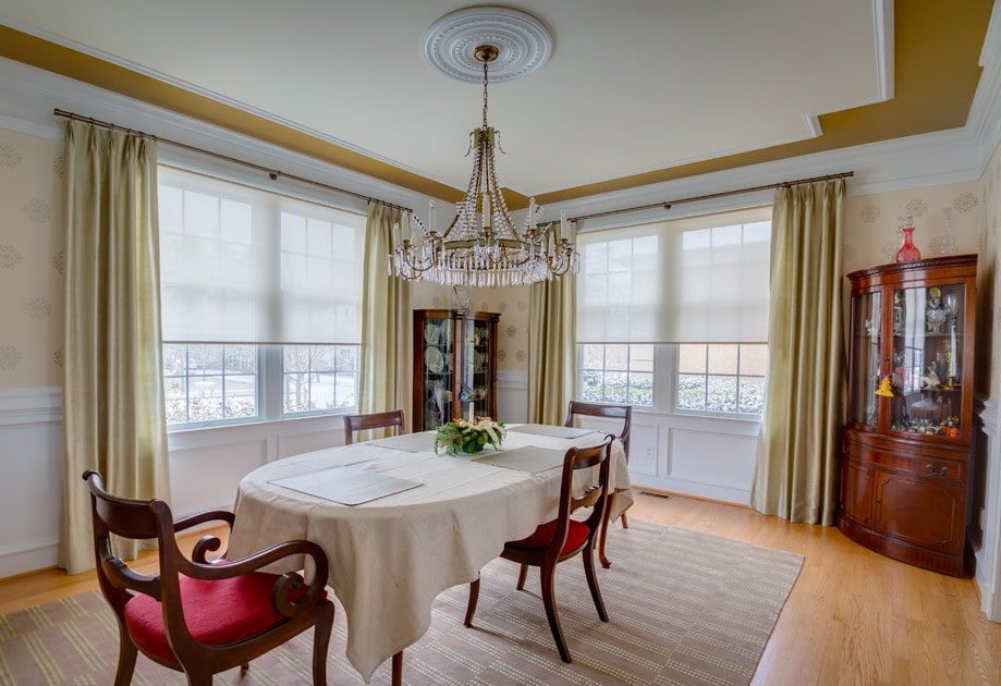 In the photo there is a dining room in a classic style with translucent blinds combined with curtains.