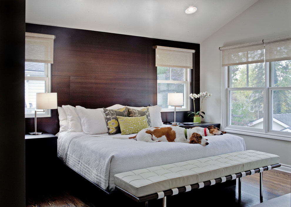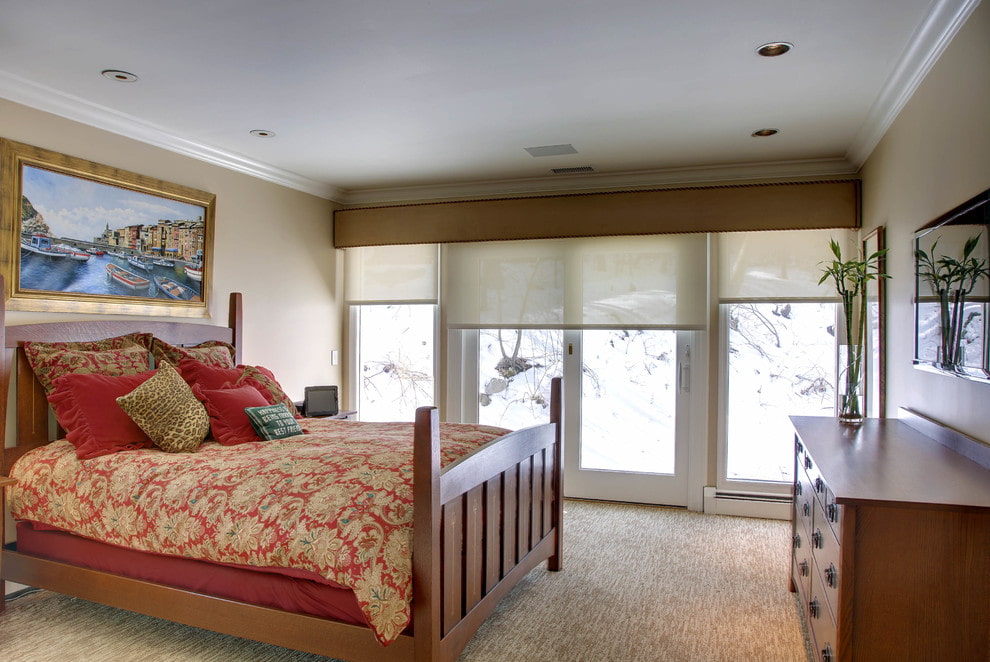 In the photo there is a bedroom in a modern style with open-type roller blinds.