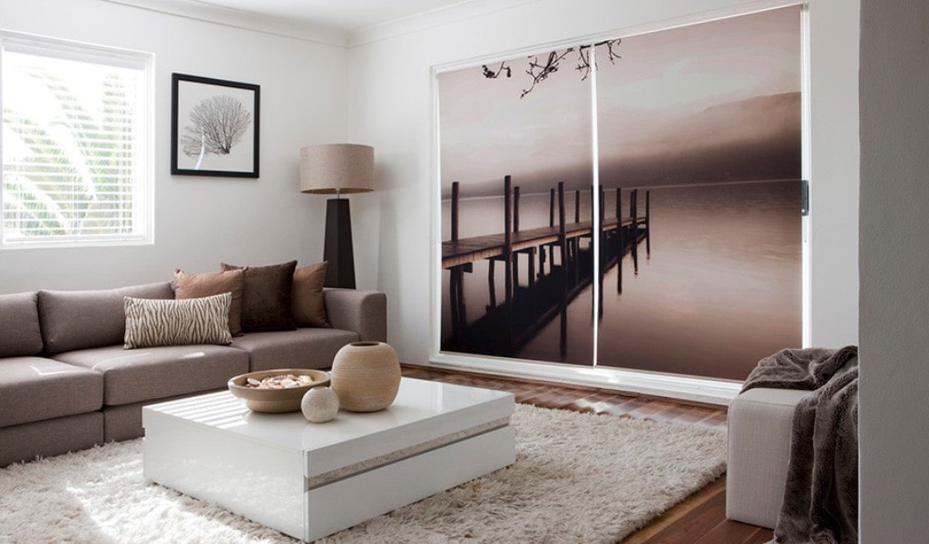 In the photo there are roller curtains decorated with photo prints in the living room.