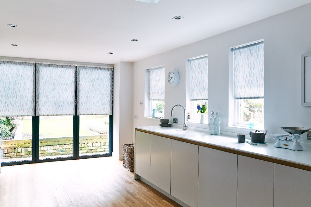 In the photo there is a kitchen with panoramic windows decorated with blue roller blinds.