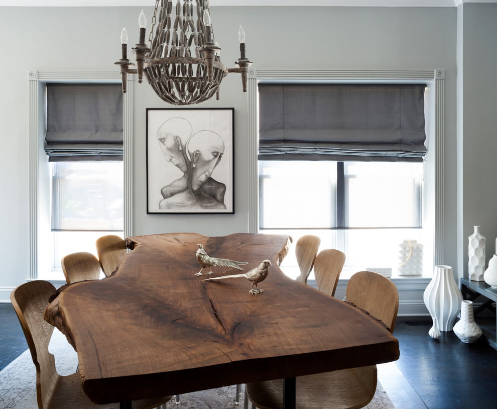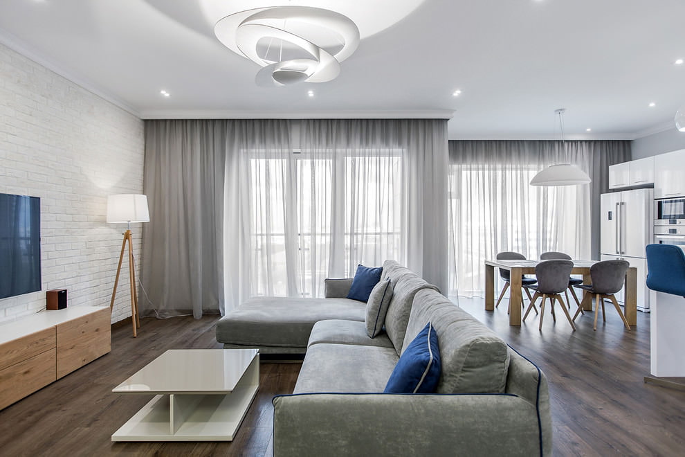 Double curtains will be an excellent solution for a kitchen-living room, you get a cozy atmosphere. Also, if desired, they will get rid of excess light.