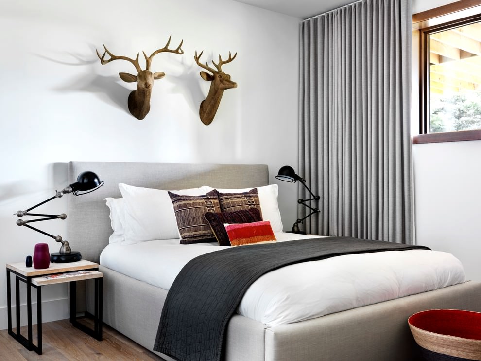 On the picture bedroom in a modern style. The gray curtains are decorated with twine garters.