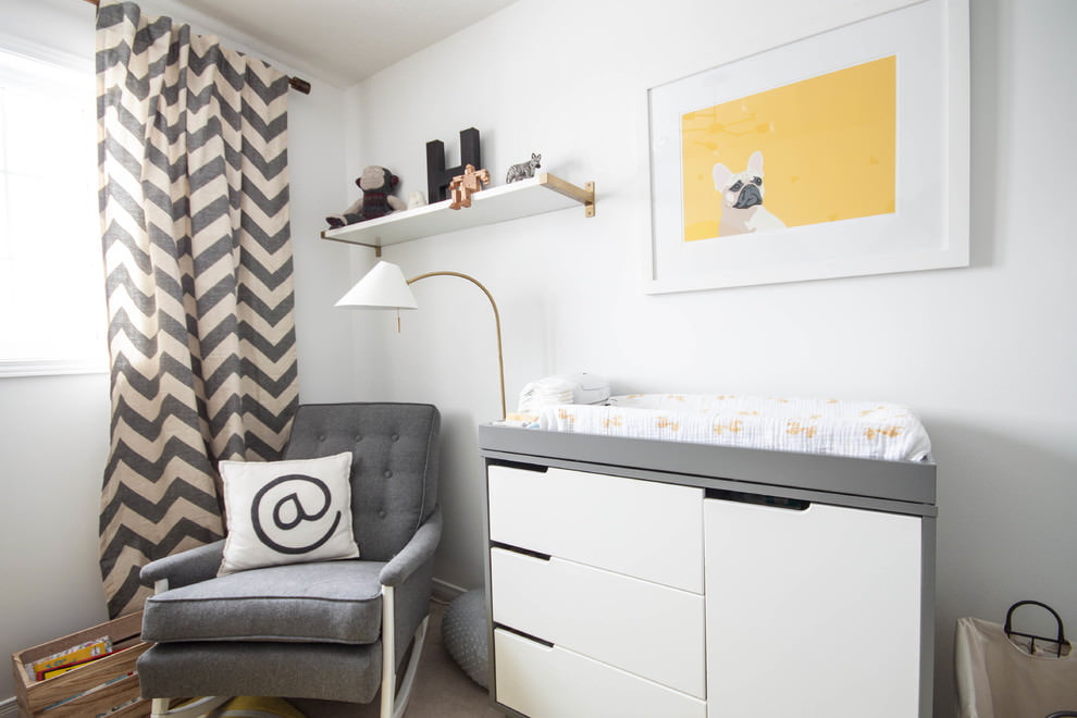 On the picture children's room in a modern style. Bright yellow accents dilute the restrained gray.