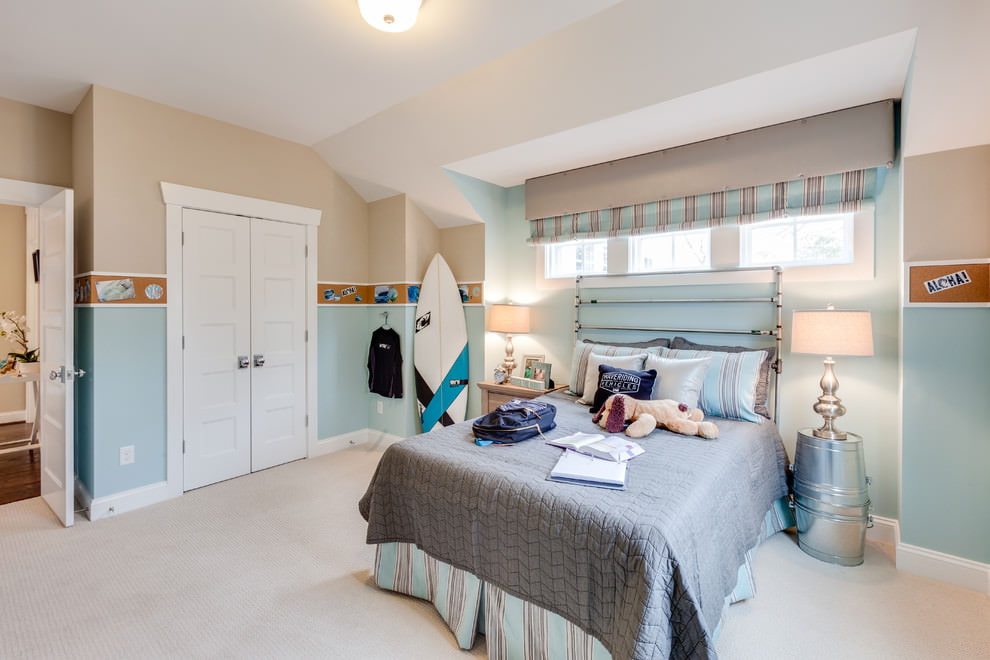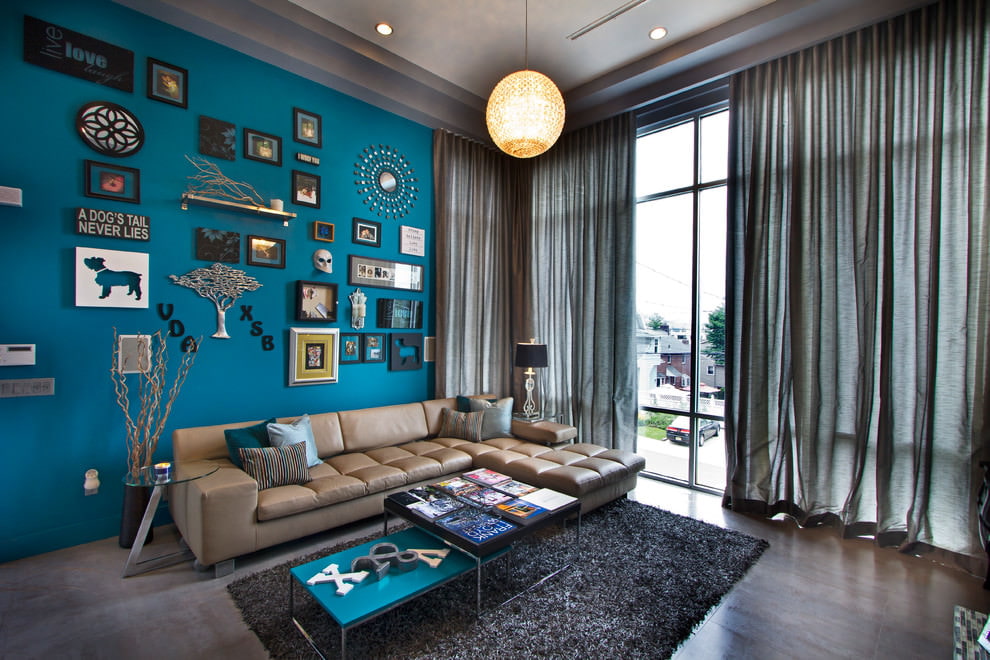 Curtains in a combination of gray and turquoise will create a light, modern interior.