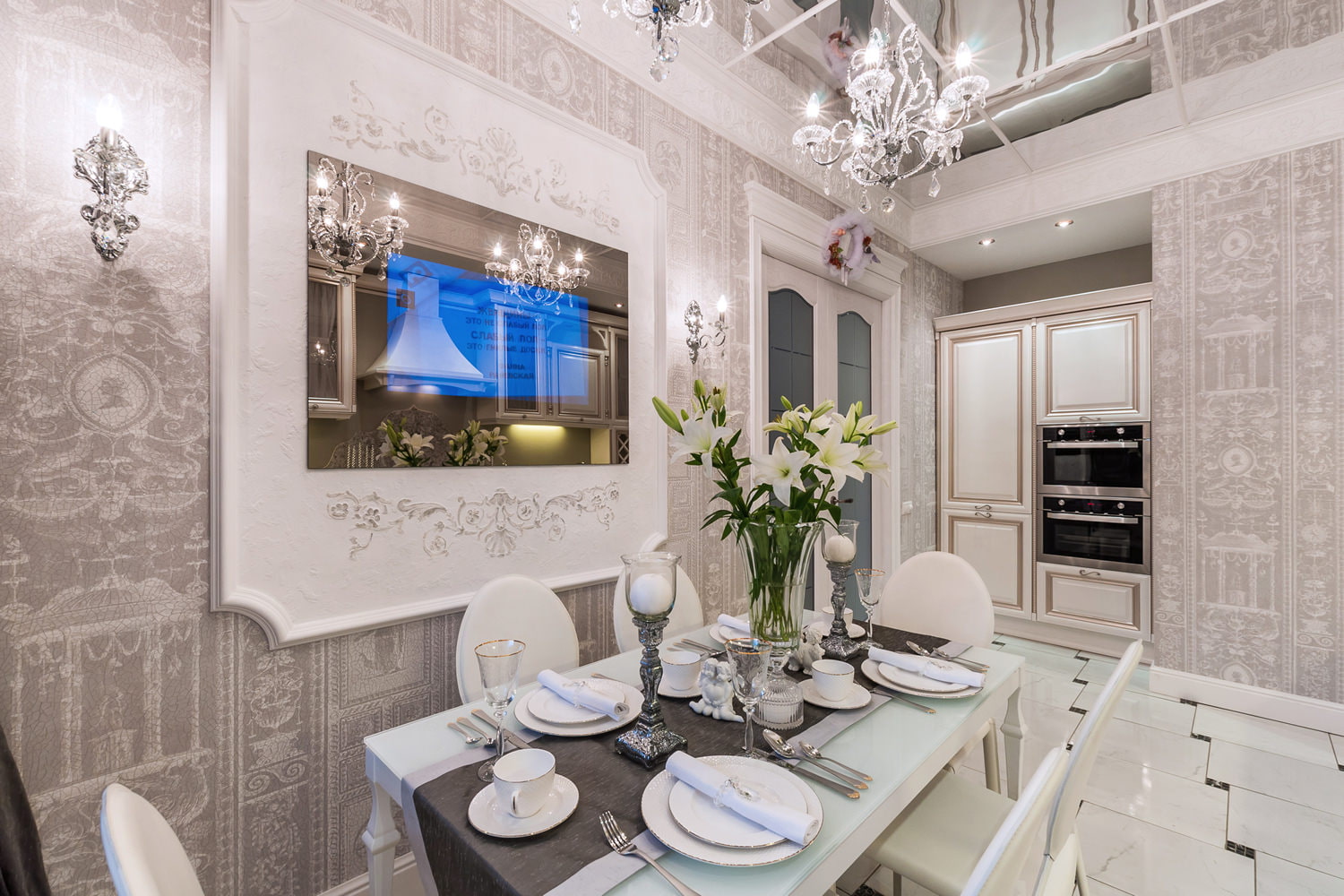 On the picture the white glass doors in the classic interior of the apartment match the wooden floor, tile floor and gray wallpaper with geometric patterns.
