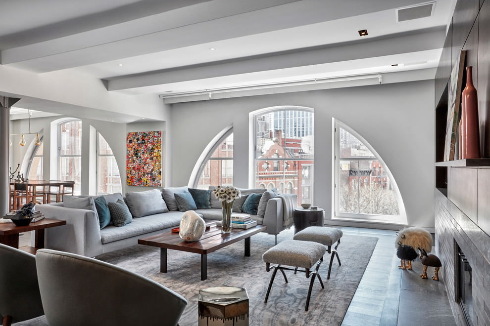 The loft, as a casual and practical style, combines brick, wood flooring and a plastered gray wall, which can be plain or with large ornamentation. Gray walls are combined with the same large sofa or bed, gray table. Combines in a loft style with white, red, turquoise and yellow.