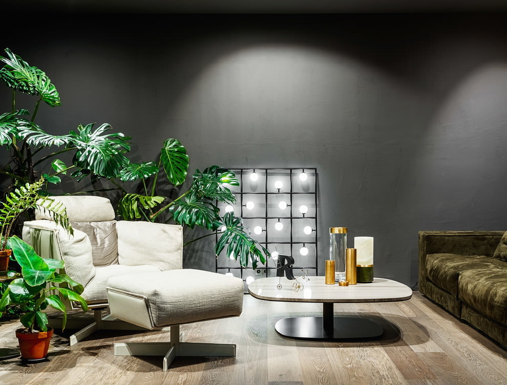 A living room in any style with gray walls will look successful. Dark gray walls should be combined with a white ceiling and light floor. Combines with green, scarlet, beige, white as a companion color for decor items and textiles. The main role is played by curtains, which should be lighter or brighter than the walls.