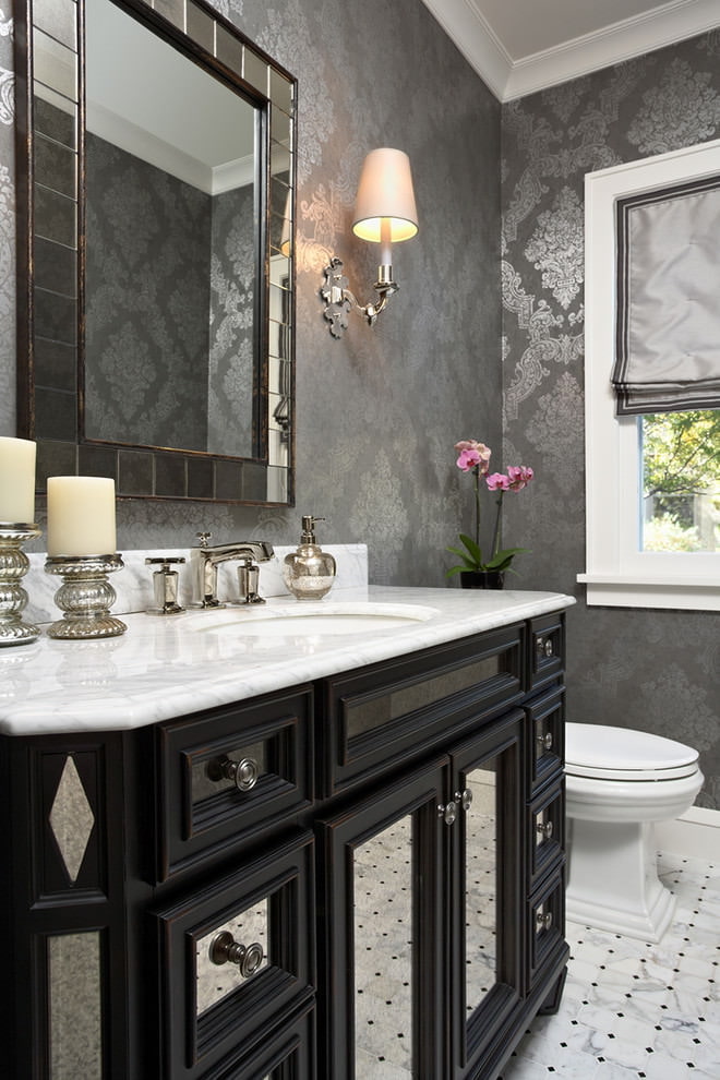 A bathroom with gray walls should be well lit and combined with a white installation, shower room, lighter floor.