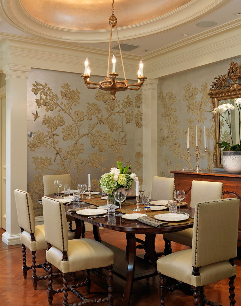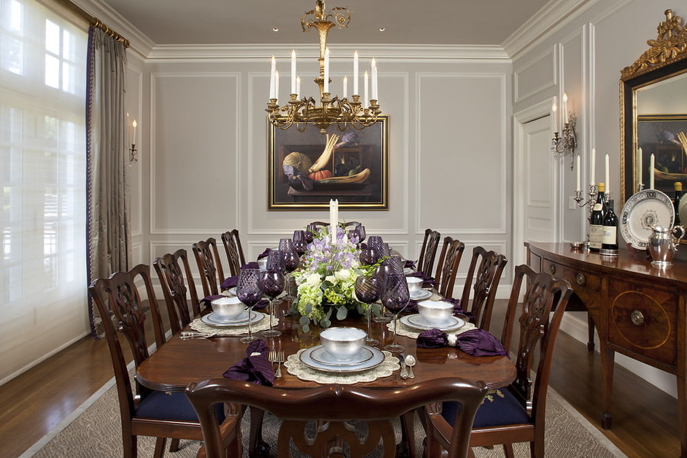 The classics in a gray interior does not look boring, the walls are complemented by molding, these can be tapestries, silk-screen printing, gold monograms, white flowers and patterns. The walls will become the backdrop for wooden furniture, a light sofa, emerald curtains, a golden lambrequin. The decor is portraits, landscapes, wall candelabra.