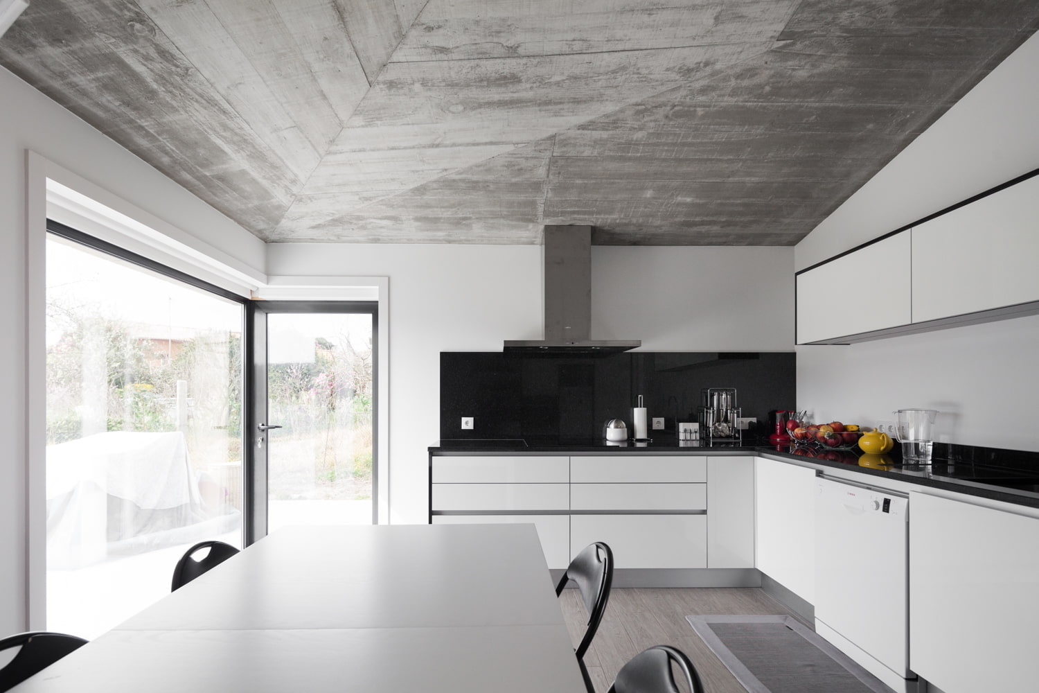 In the photo there is a kitchen in light colors with a gray wooden ceiling.