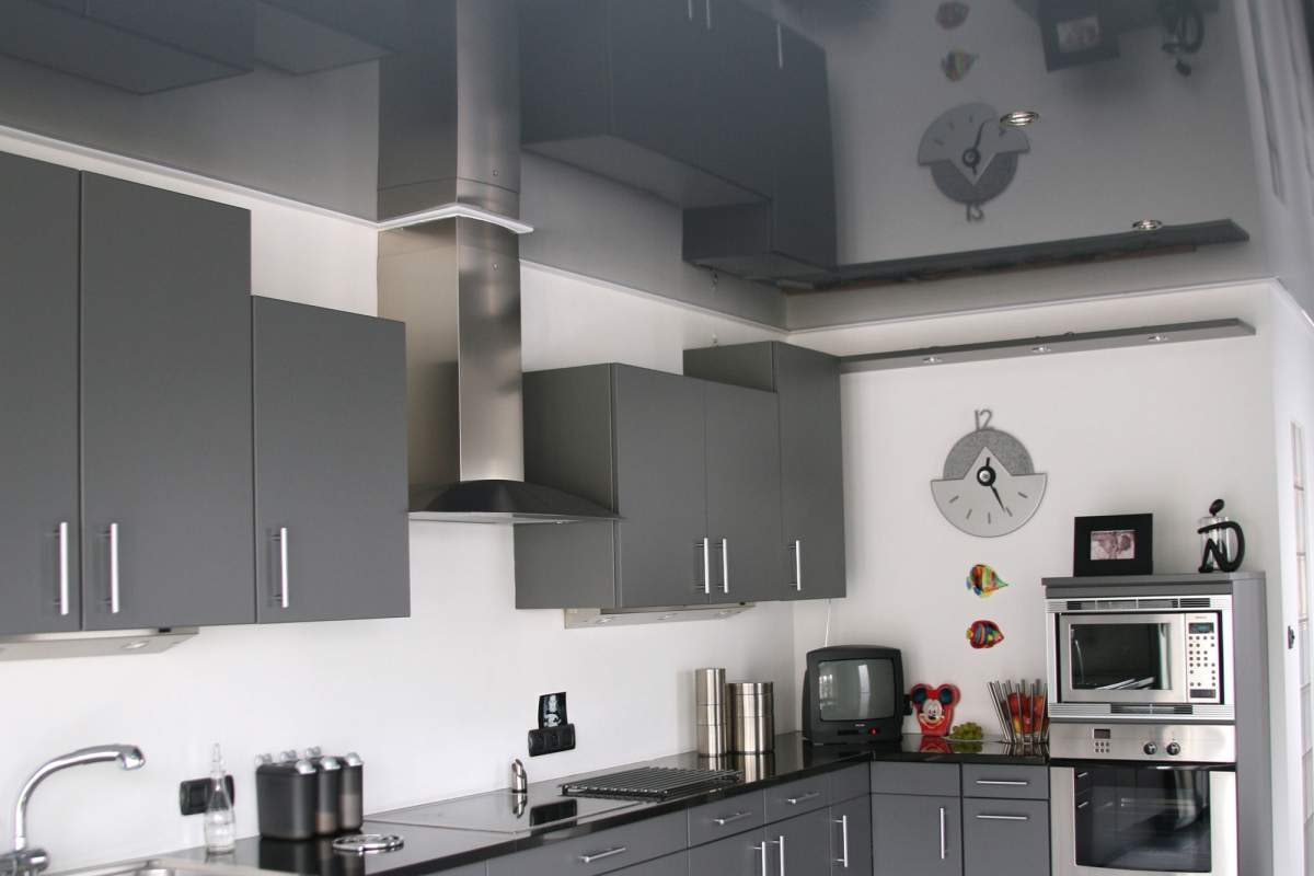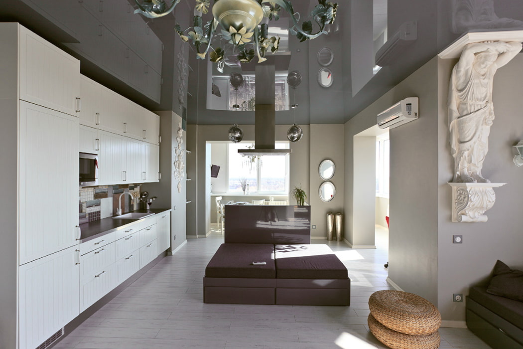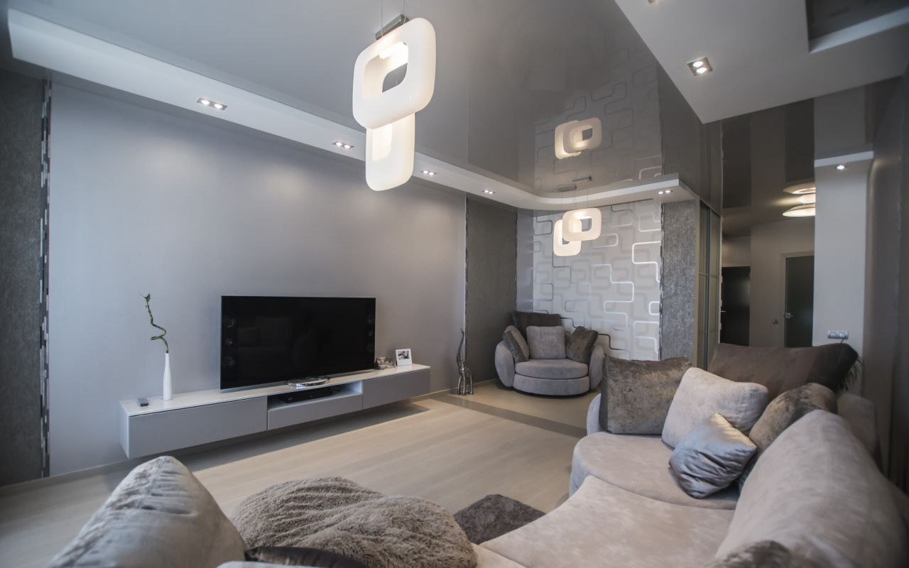 The photo shows a gray glossy stretch ceiling in a high-tech living room.