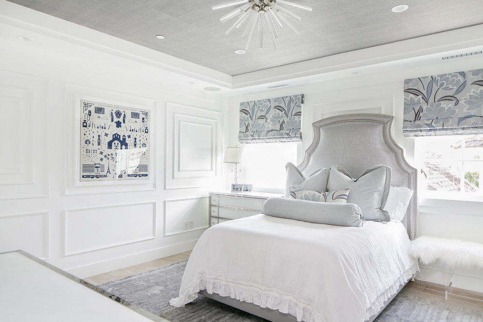 In the photo there is a gray ceiling decorated with a chandelier in the interior of the bedroom.