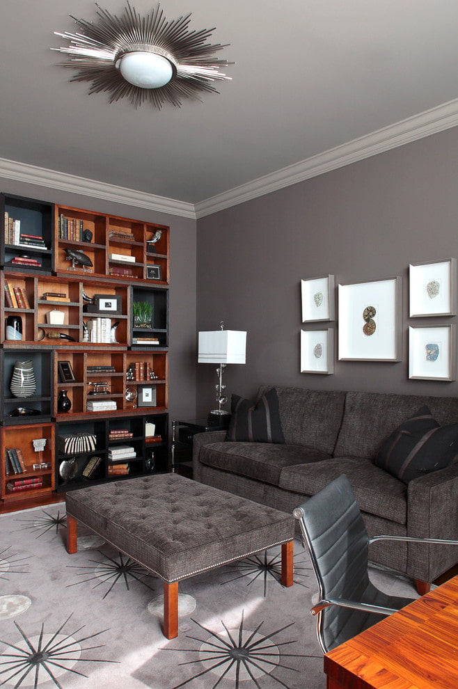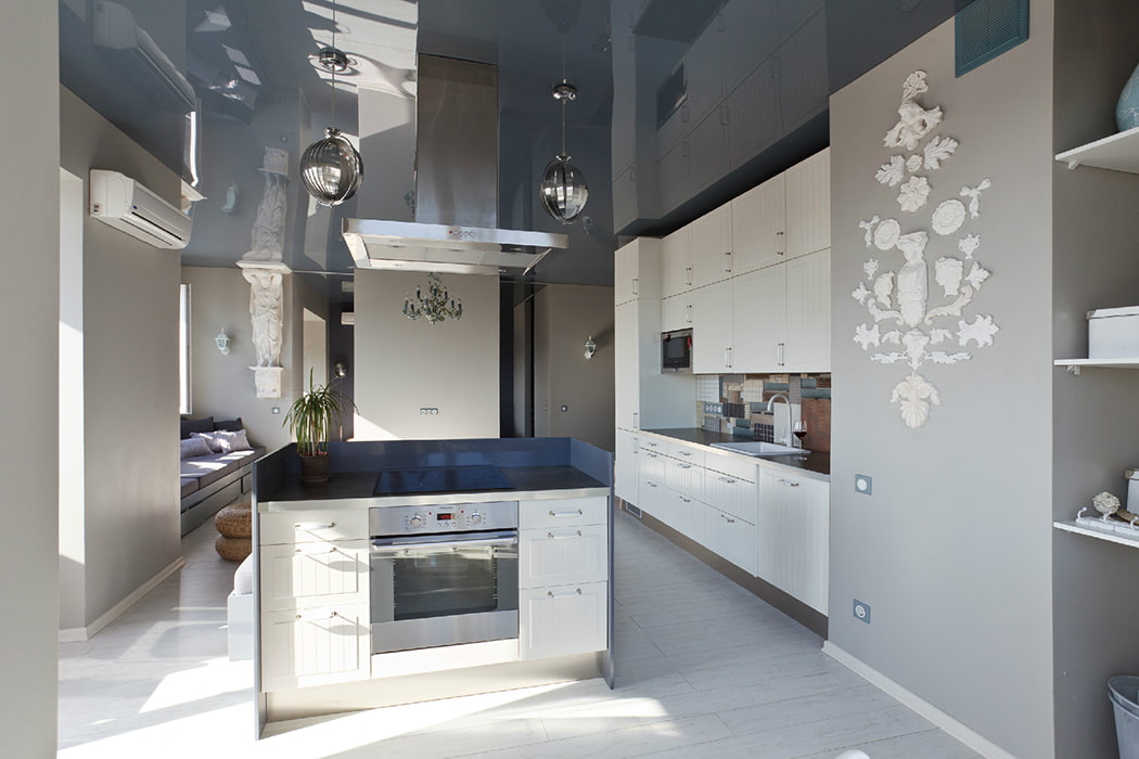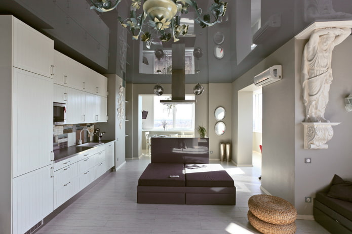 The gray ceiling, despite its discreet restrained appearance, looks multifaceted and original in the interior and undoubtedly forms a stylish and very aristocratic design.