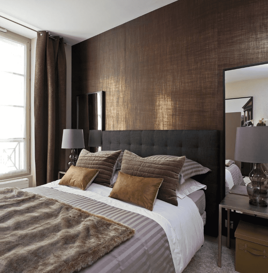 Pictured is a modern bedroom with black silk wallpaper on the walls.