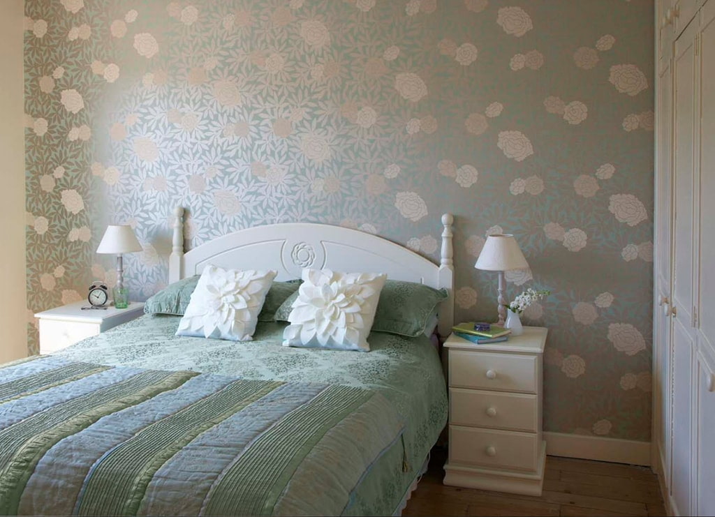 In the photo there is a bedroom decorated with green silk wallpaper.