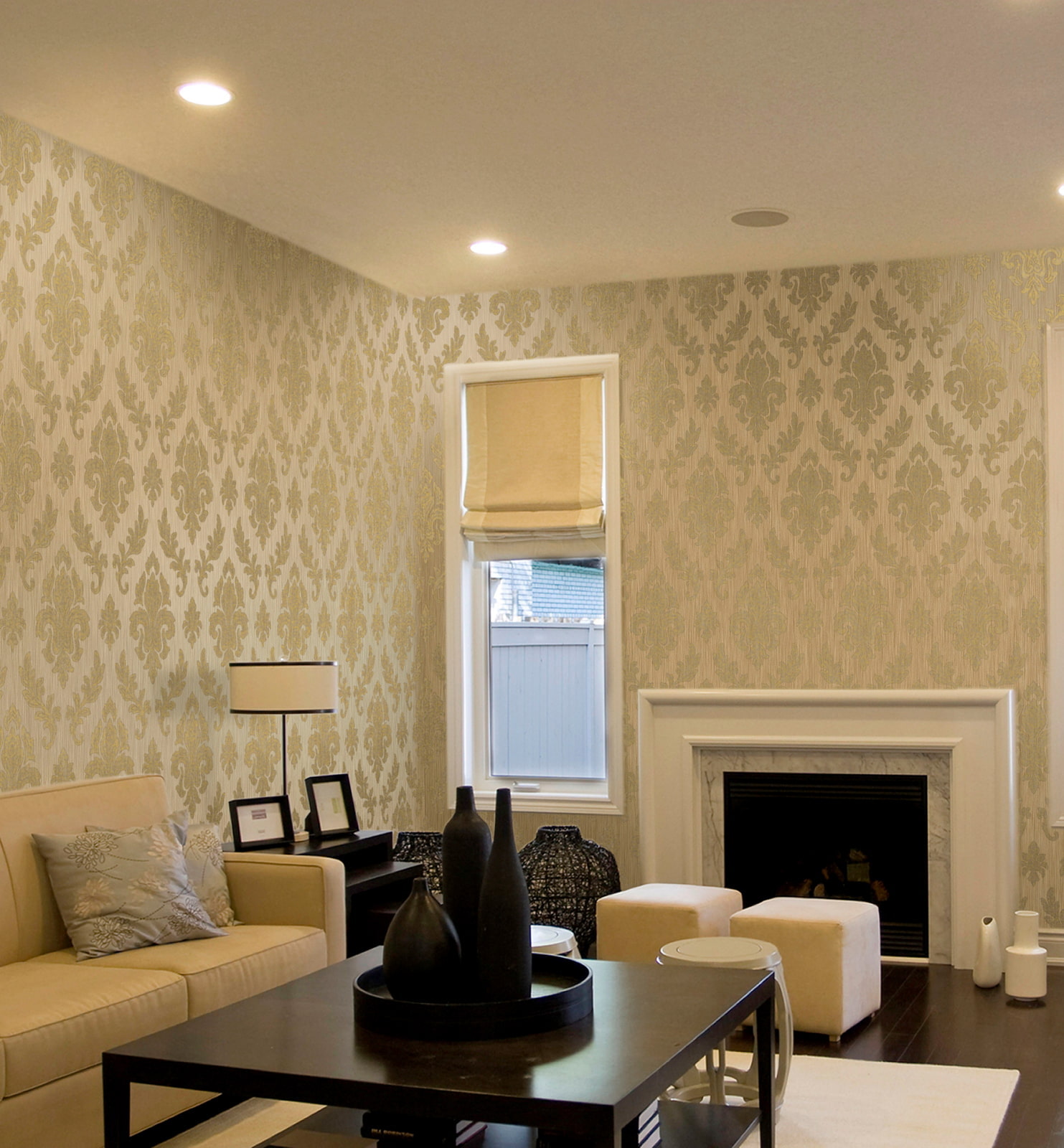 Pictured is a living room with silk textile wallpaper on the walls.
