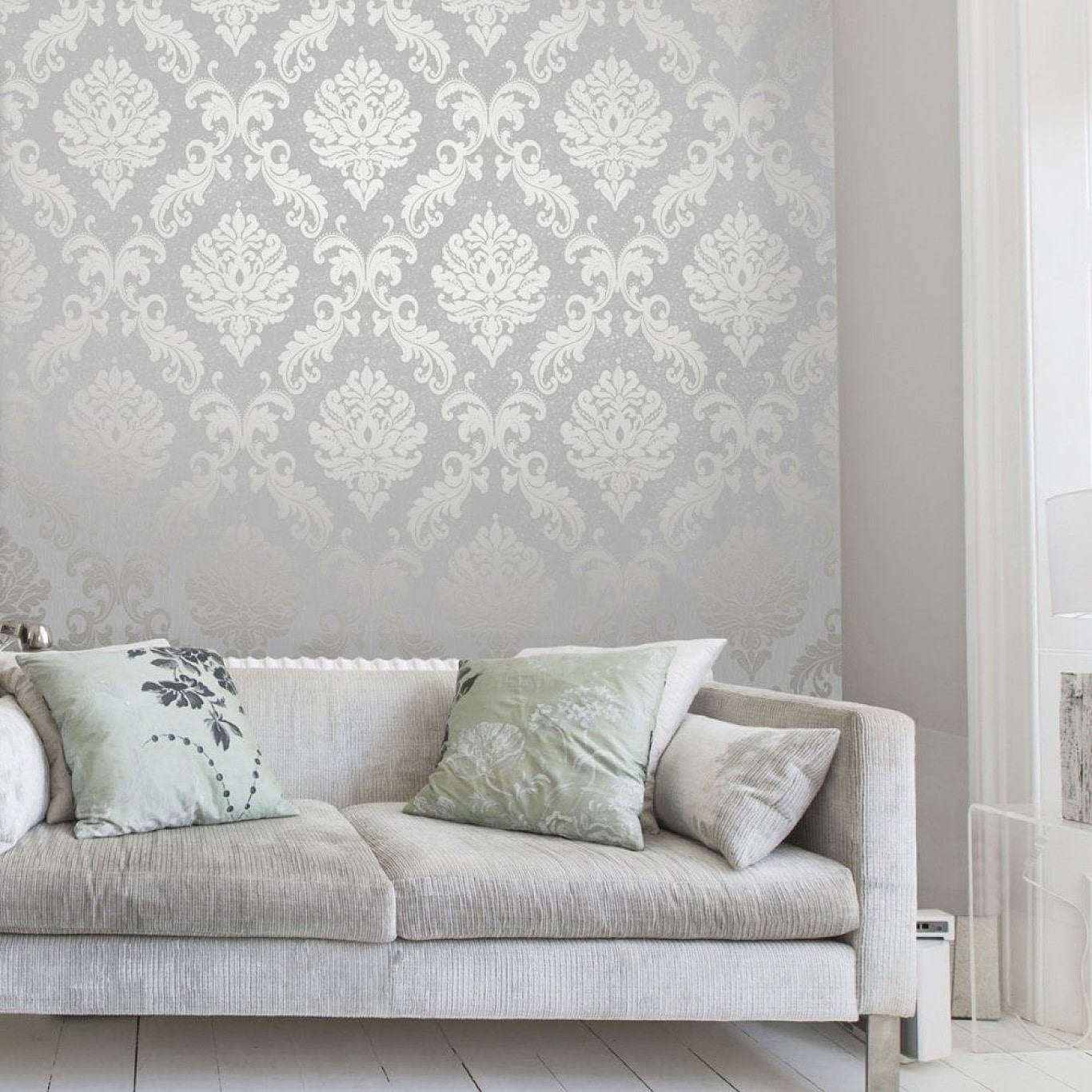In the photo there is a bedroom interior and a wall with silvery silk wallpaper.