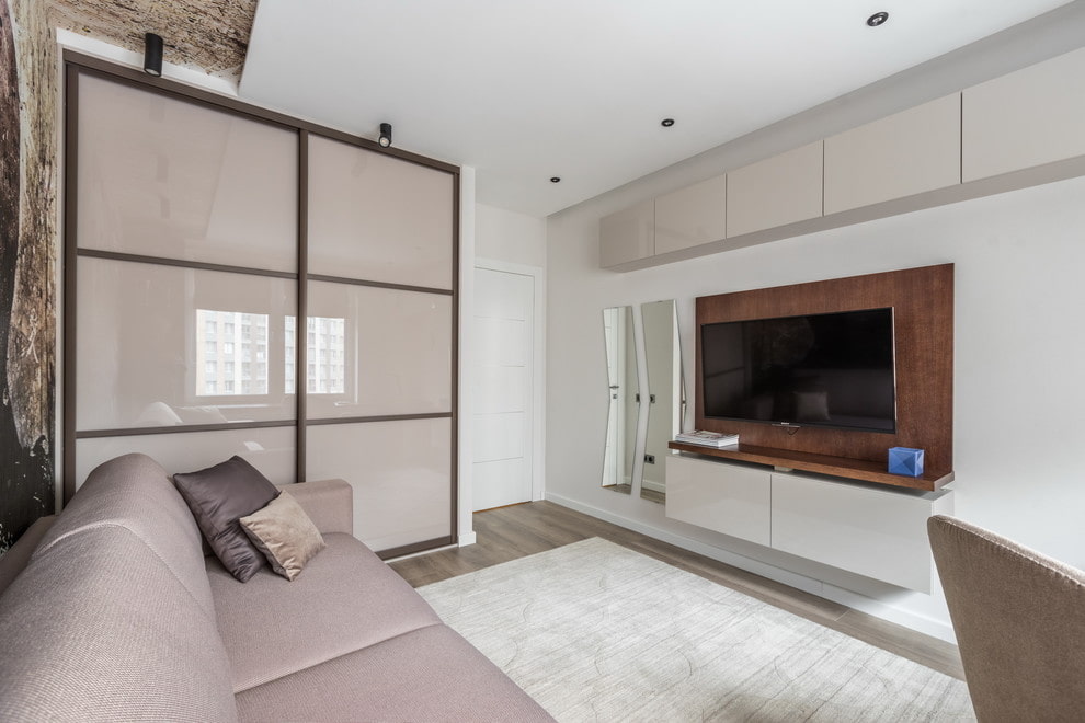 - Competently selected wardrobe in the living room organically complements the decor and organizes a convenient storage for the necessary items.