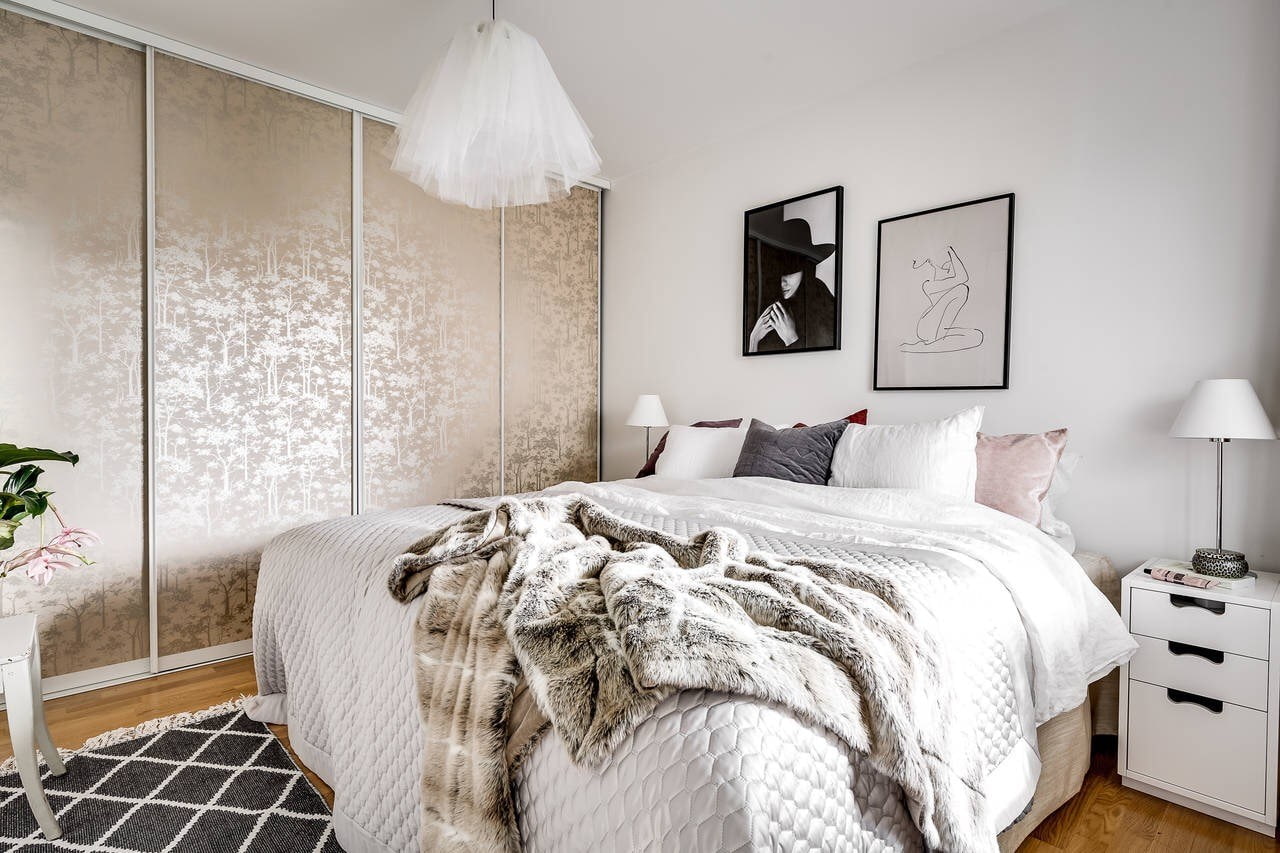 The photo shows a free-standing wardrobe with frosted glass doors in a room designed in Scandinavian style.