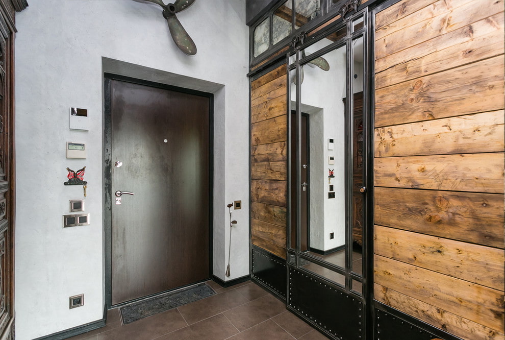 In the photo there is a loft-style entrance hall with a wardrobe made of wooden boards and metal.