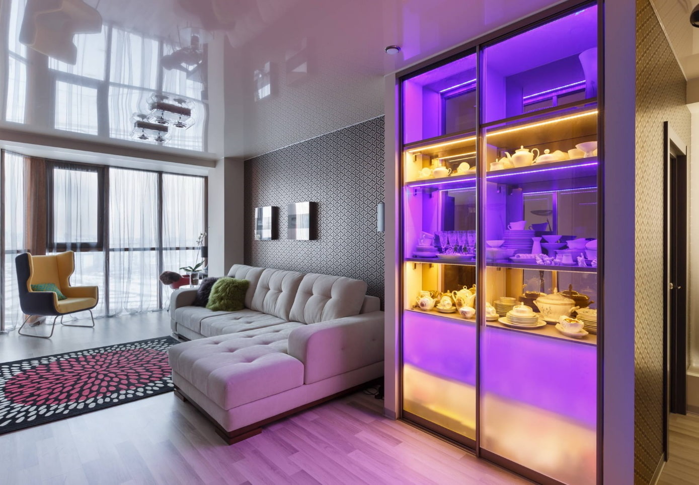 In the photo there is a living room with a high wardrobe, the glass facades of which are equipped with lighting.