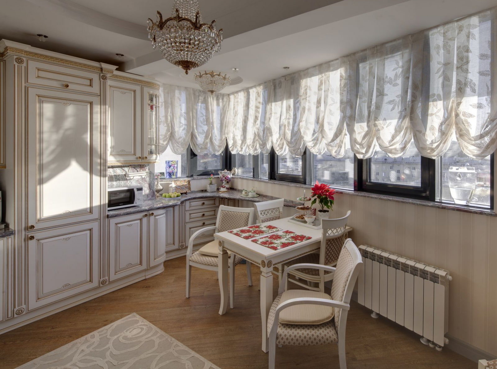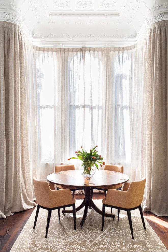 In the photo there is a dining room in a classic style with decor on the windows in the form of white translucent organza curtains.