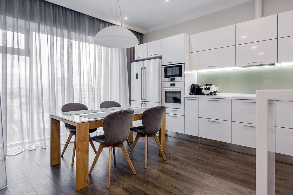 In the photo there is a spacious kitchen with laconic gray organza curtains.