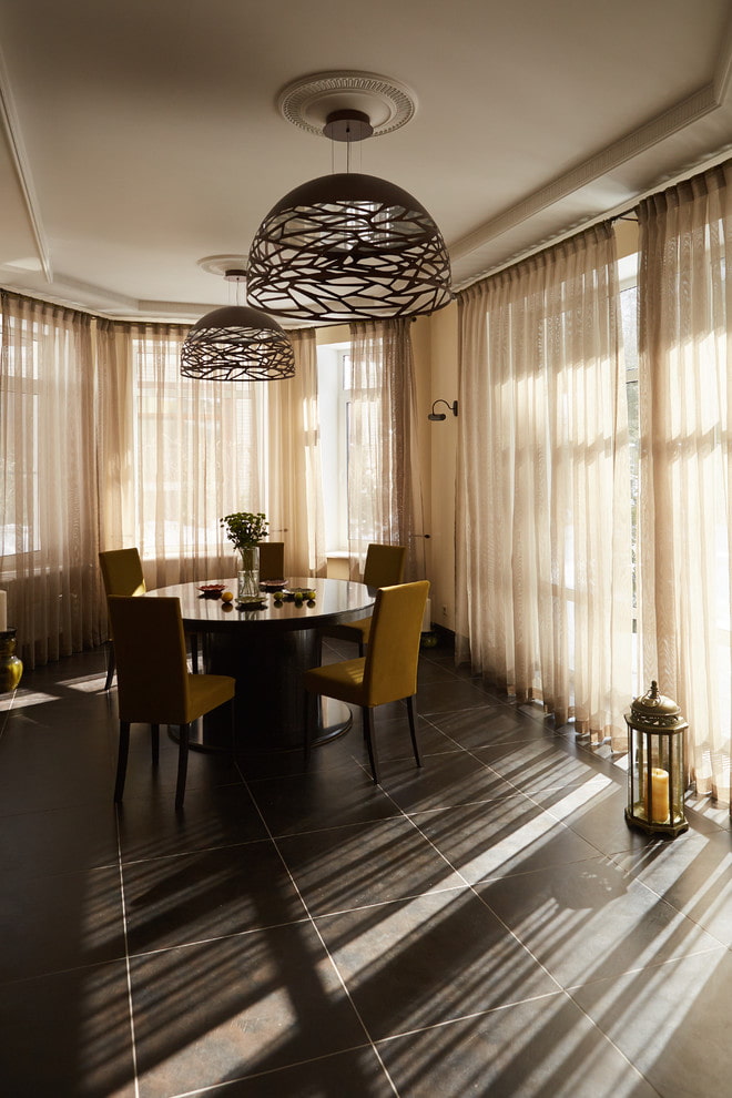 In the photo there are long curtains made of brown translucent organza in combination with thick curtains.
