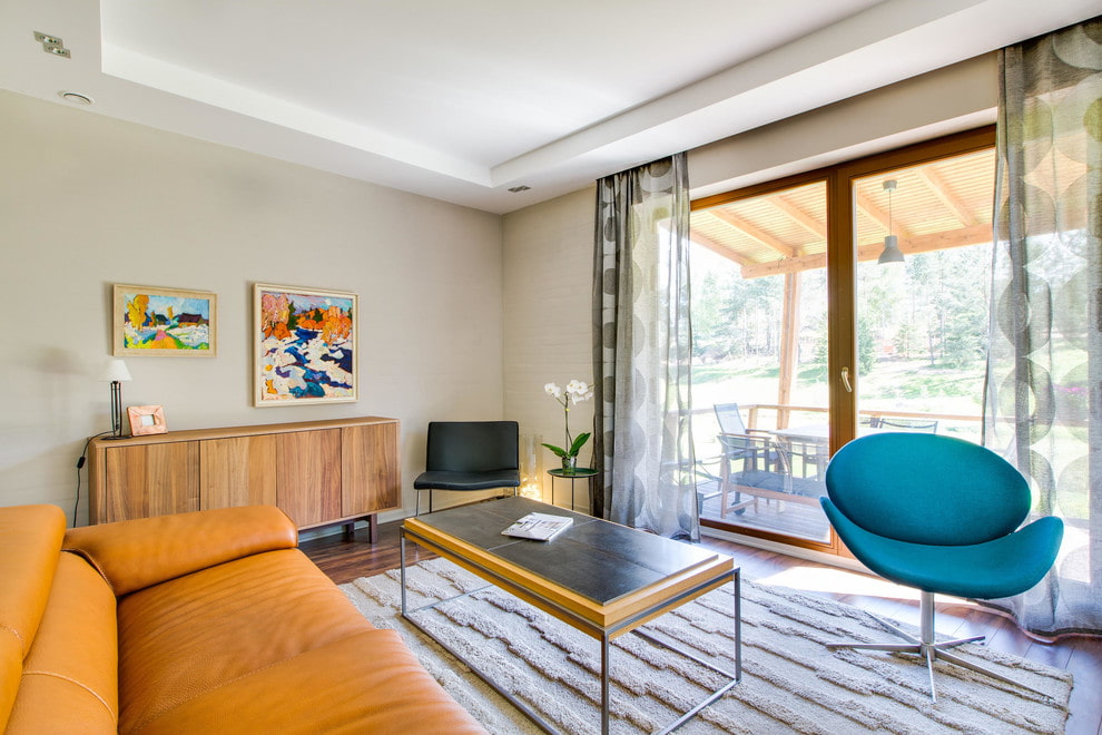 The photo shows a living room in a modern style with translucent organza curtains.
