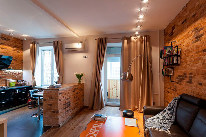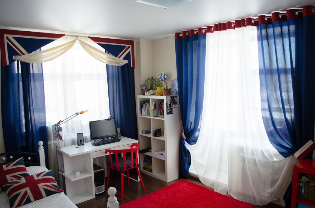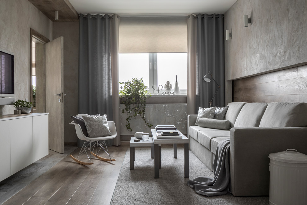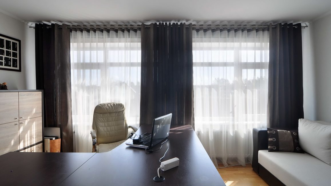The most popular solution is thick fabric curtains combined with Roman shades. Light curtains on eyelets look stylish in combination with roller blinds or drapes.