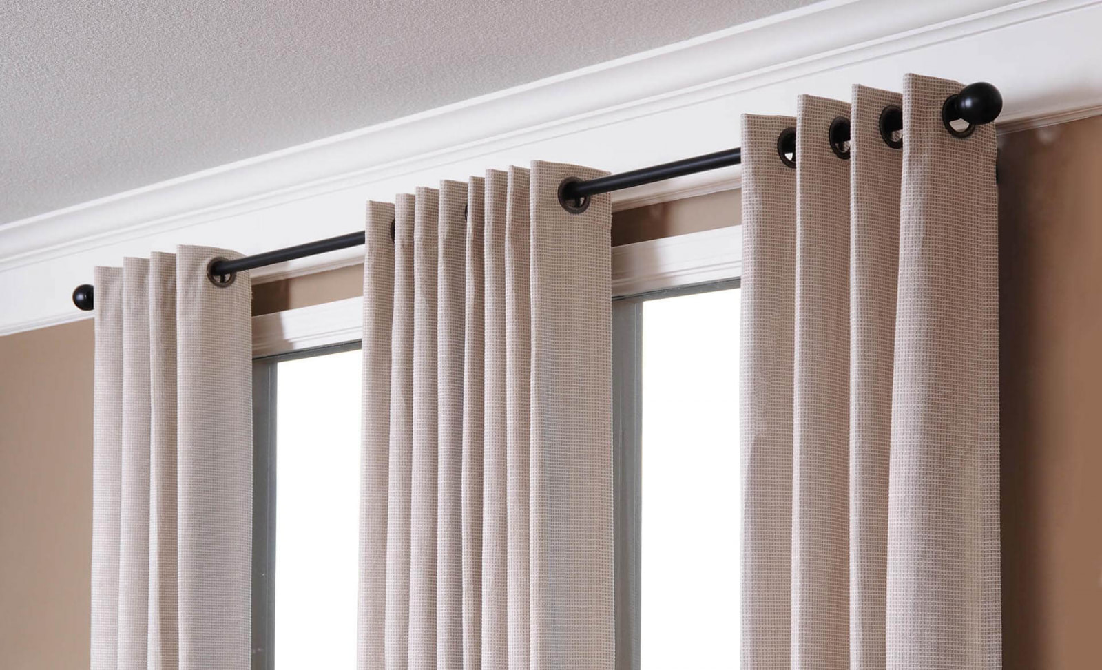 In the photo there is a living room with curtains on grommets on the bay windows.