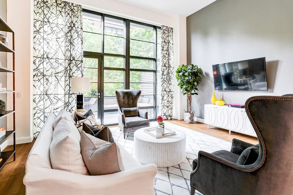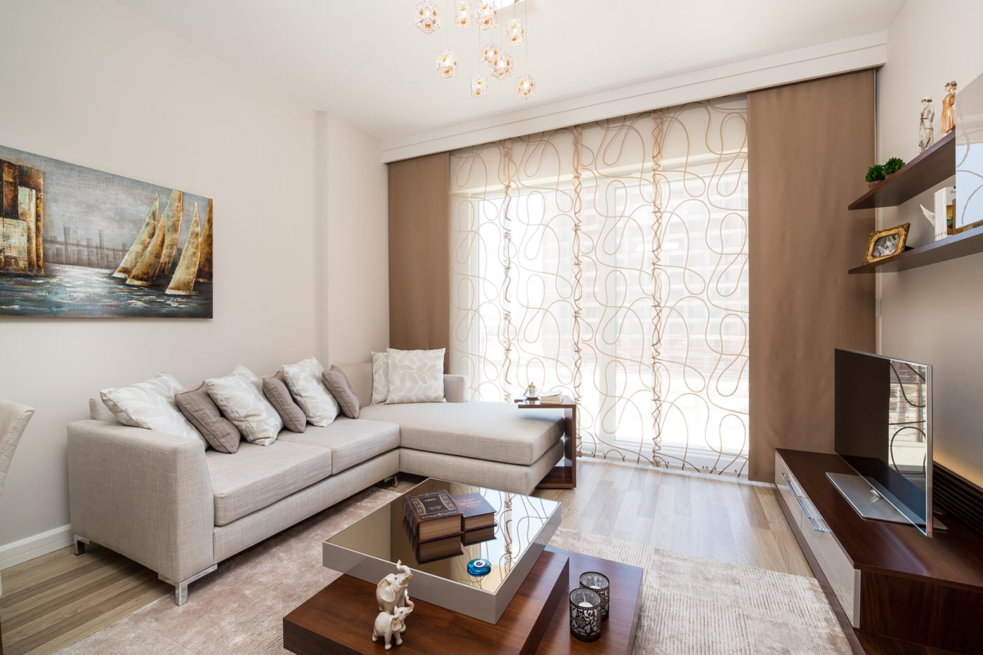 In the photo there is a living room in light colors and curtains with an abstract print on the window.