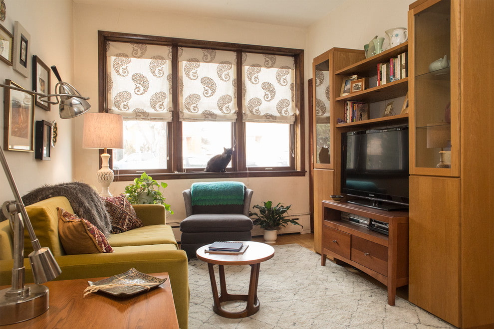 Not too large rhombuses on the curtains will not catch the eye and create a too flashy interior. Such an ornament always looks colorful.
