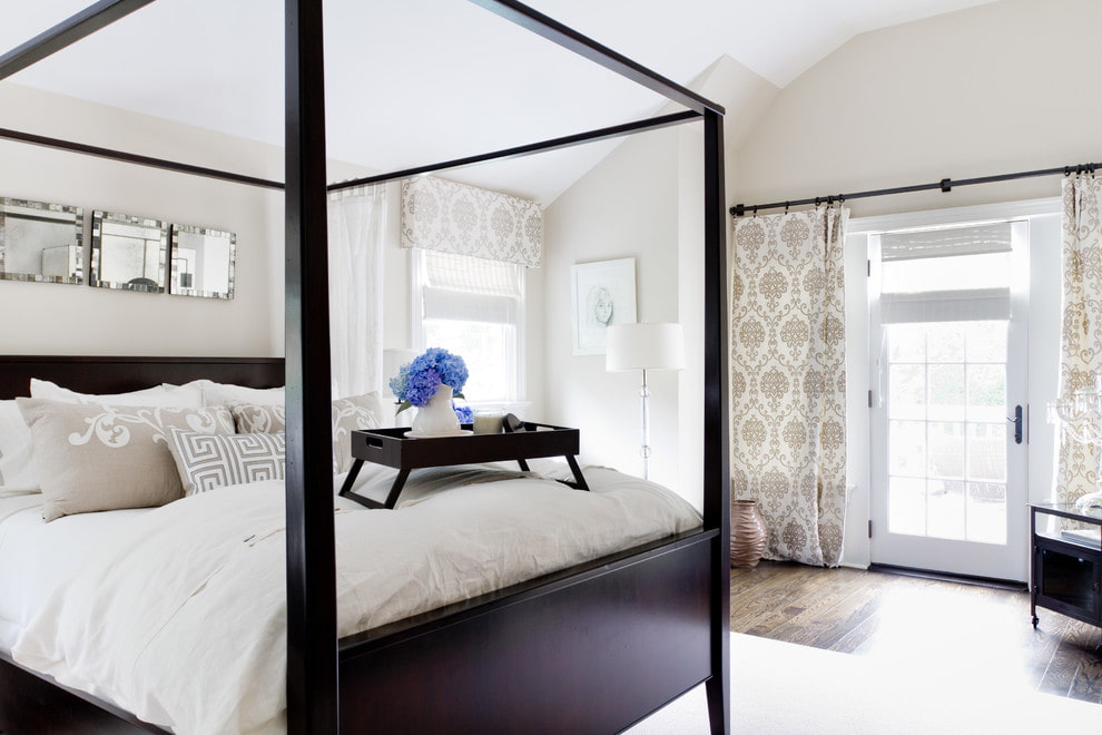 In the photo there are curtains with an ombre effect in the interior of the bedroom.