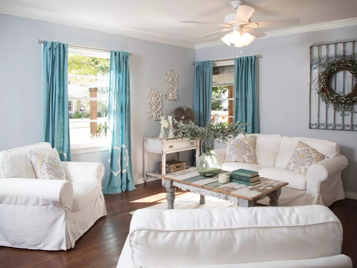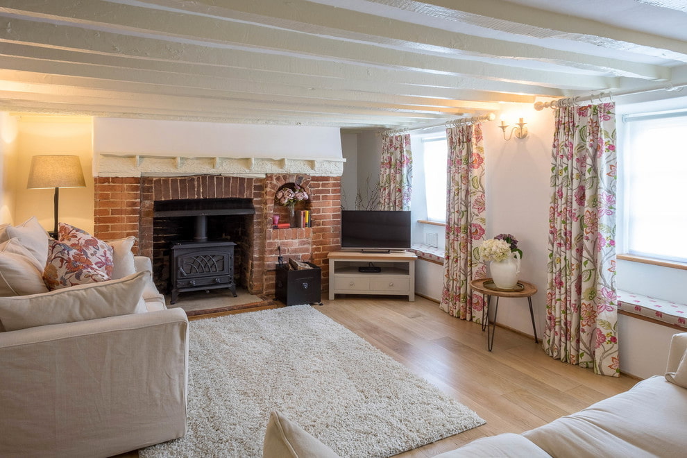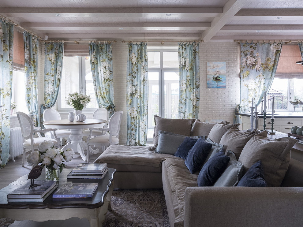 In the photo there is a Provence-style living room and curtains with flowers on the windows.