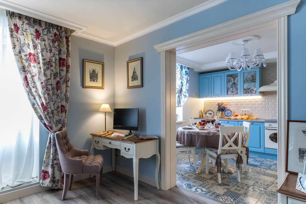 In the photo there is a Provence style kitchen and blue curtains on the window.