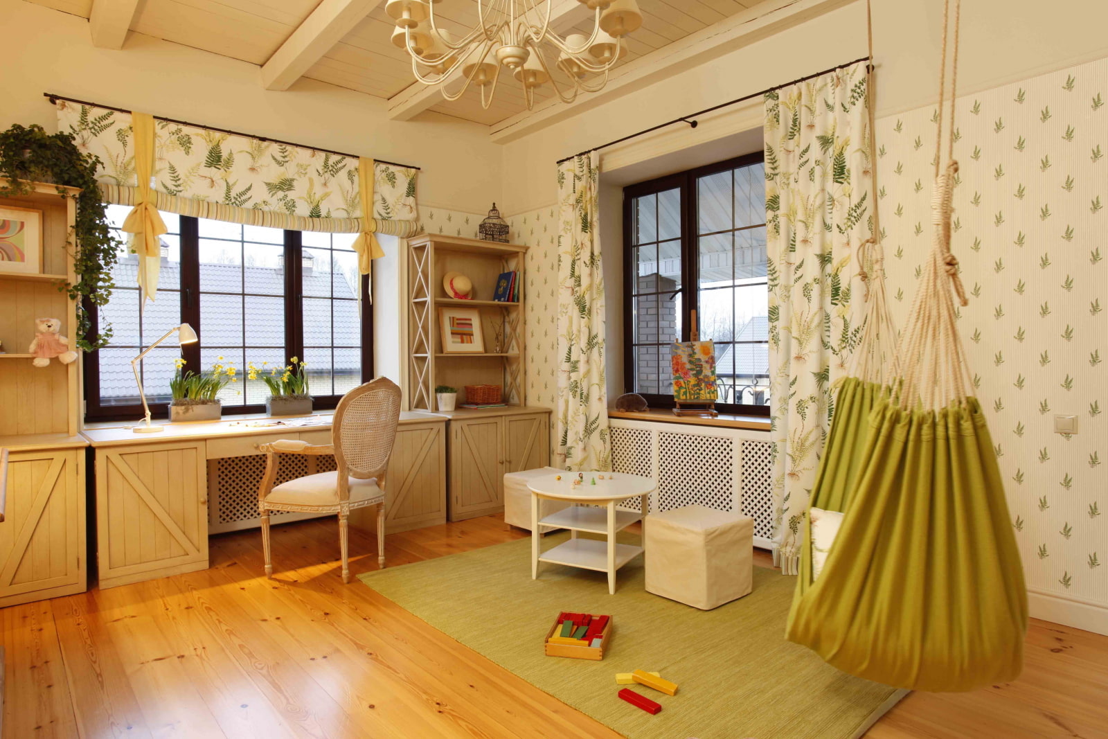 In the photo there are curtains with a tropical pattern on the windows in a spacious nursery, decorated in Provence style.