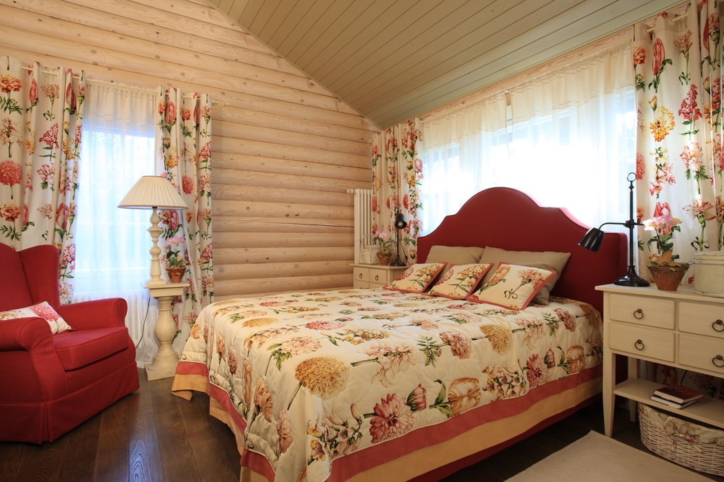In the photo there is a Provence-style bedroom and double curtains on the window.